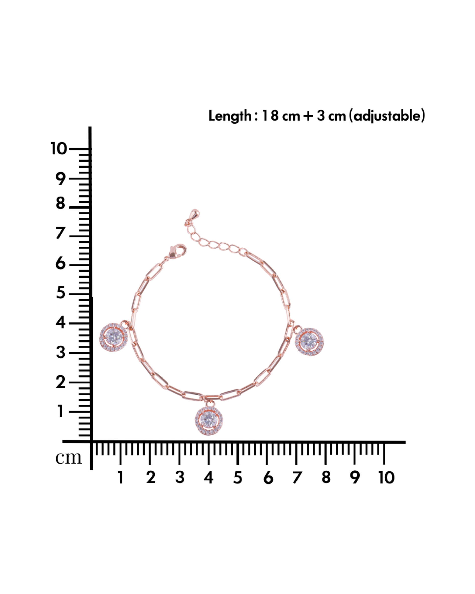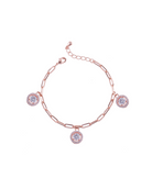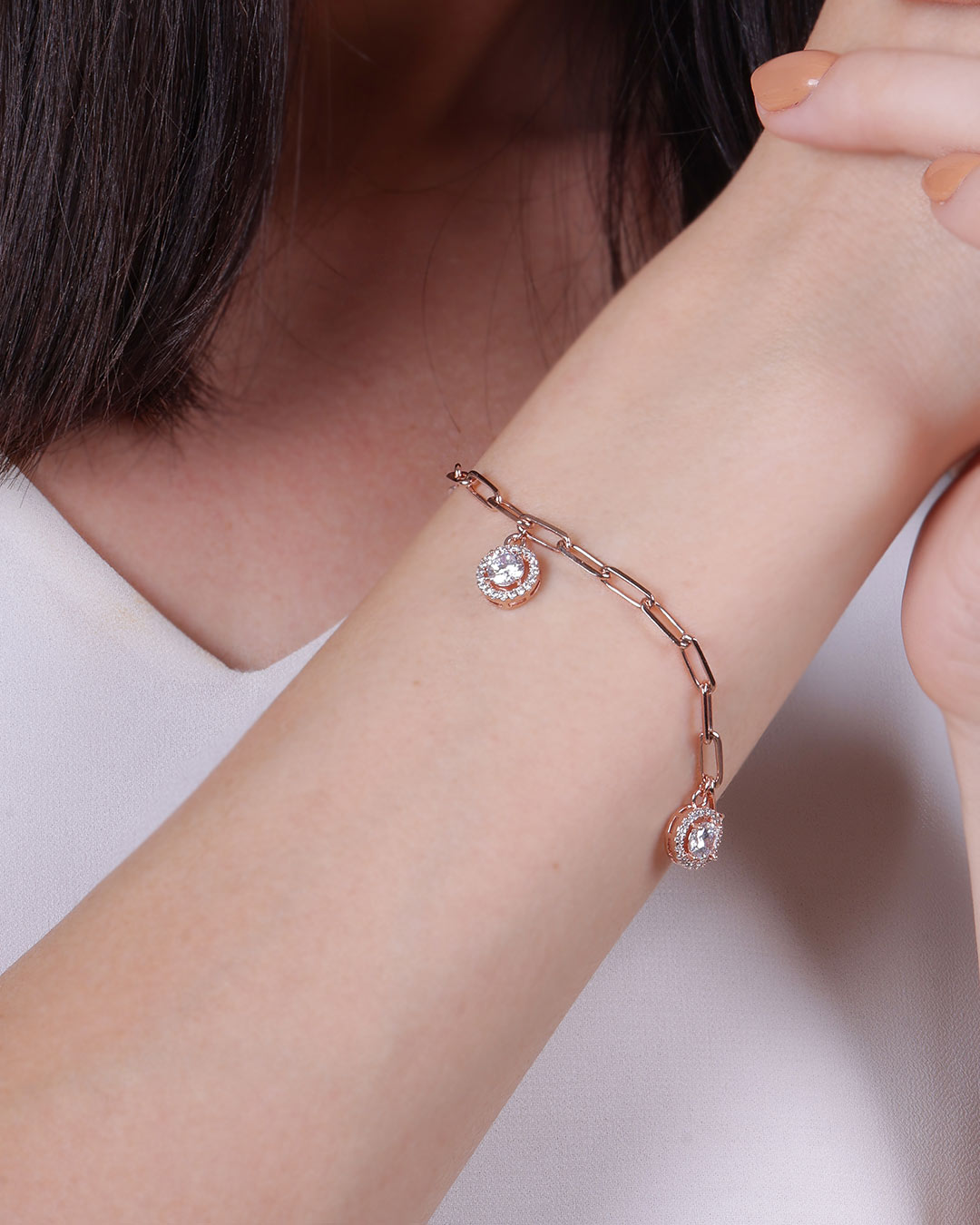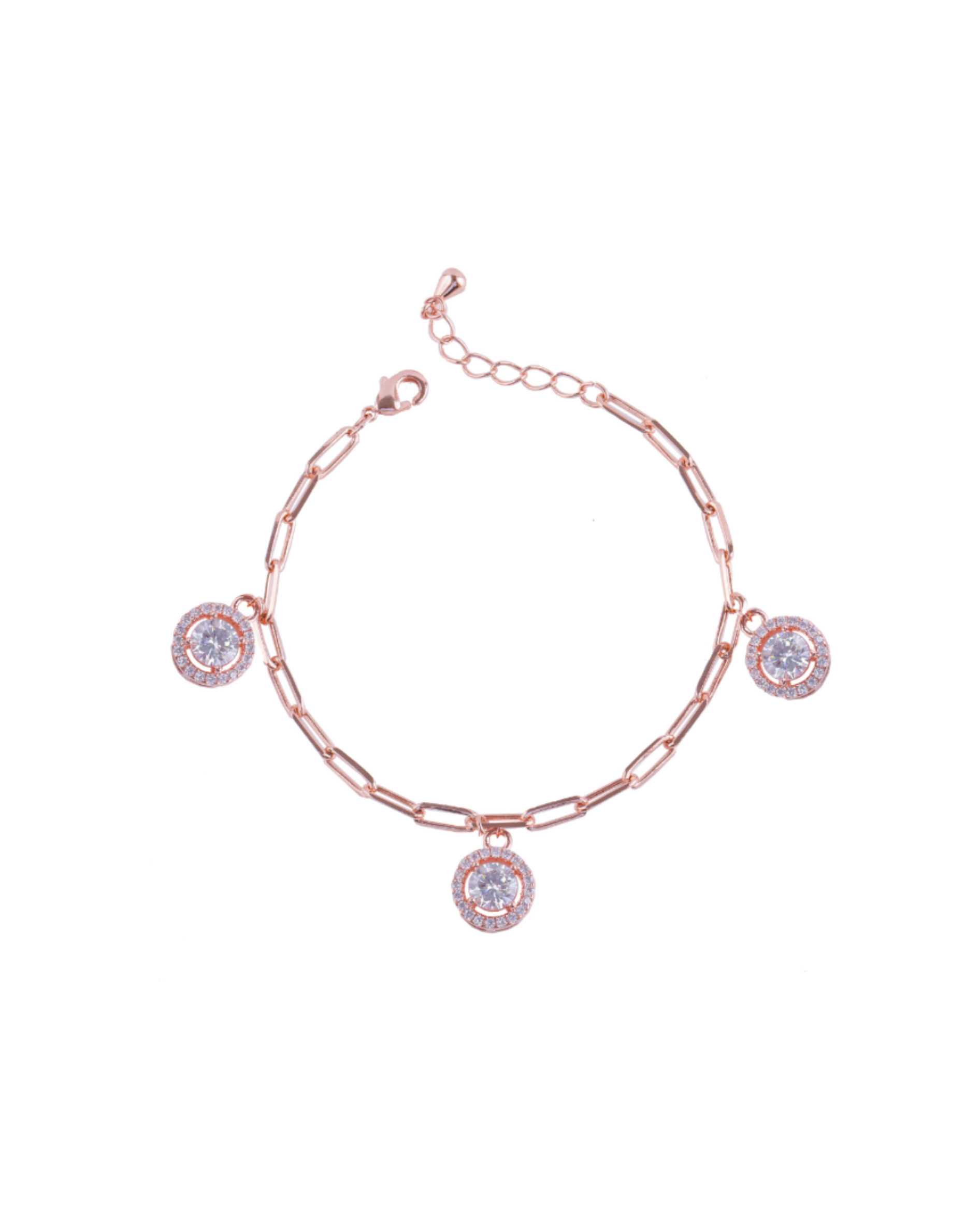 The Solitaire Charm Sleek Bracelet in rose gold is a captivating piece of jewelry that radiates understated luxury. This bracelet features a central charm with a stunning small diamond surrounded by a halo of larger round diamonds, creating a brilliant contrast and maximizing the sparkle. The smooth, sleek rose gold band complements the diamonds' brilliance, enhancing the bracelet's elegant, contemporary design. With its perfect balance of subtlety and glamour, this bracelet is a timeless addition to any jewelry collection, ideal for both day-to-night wear.