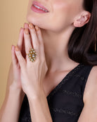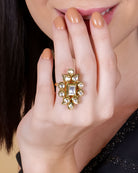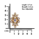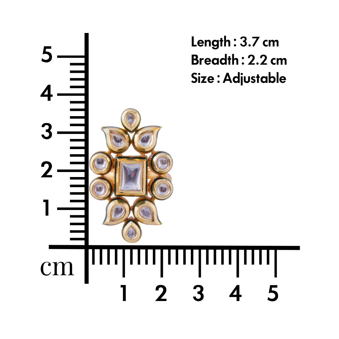 The gold-plated band complements the Kundan centre piece perfectly, adding a touch of opulence and sophistication. The intricate detailing on the band further enhances the overall beauty of the ring, making it a statement piece that will capture attention and admiration.
