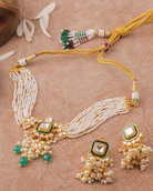 The choker features intricately arranged Kundan stones, each reflecting a radiant brilliance that is enhanced by the delicate pearls that surround them. The harmonious blend of Kundan and pearls creates a look that is both traditional and versatile, making this set a perfect choice for weddings, festive celebrations, or any occasion where you want to shine.