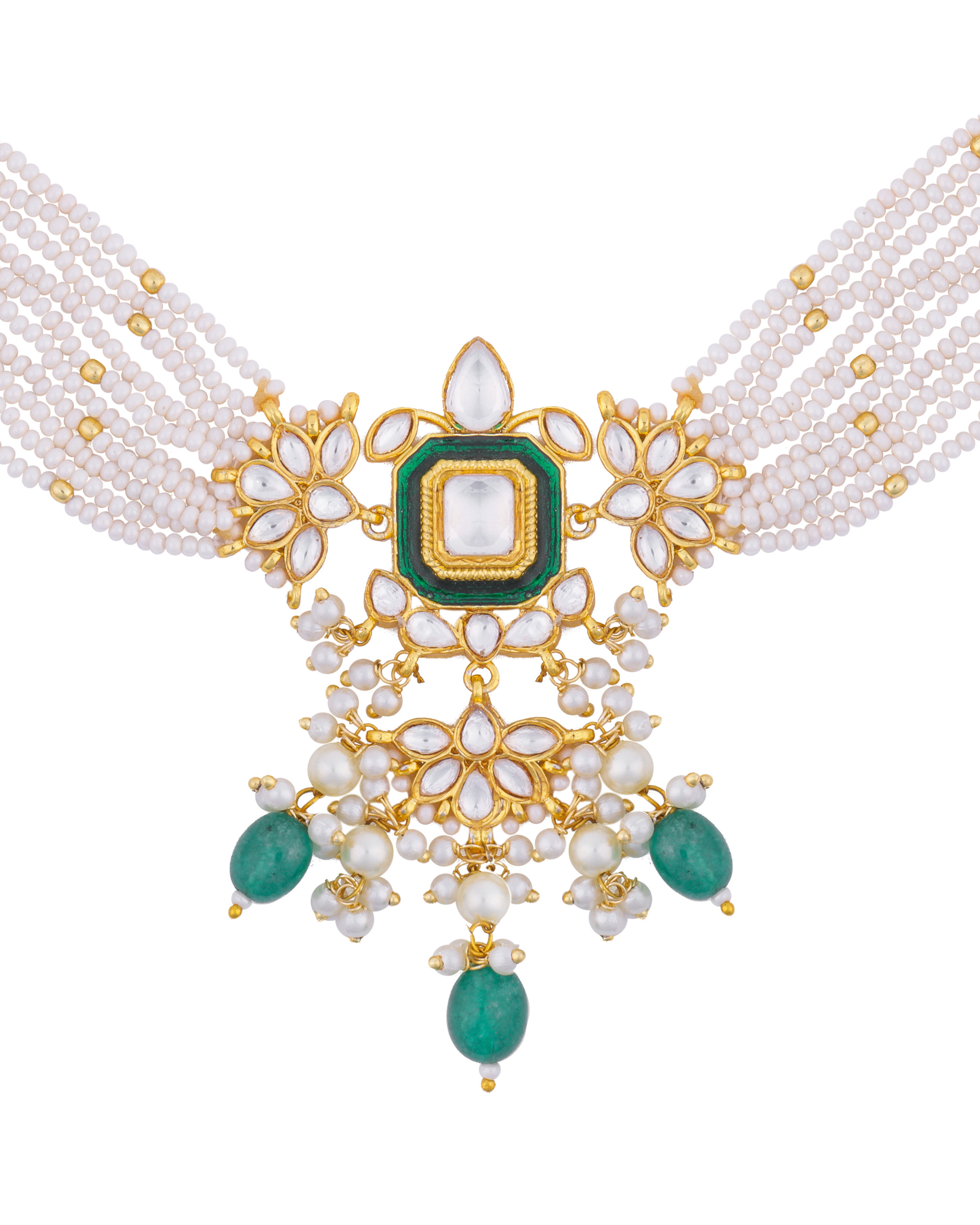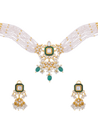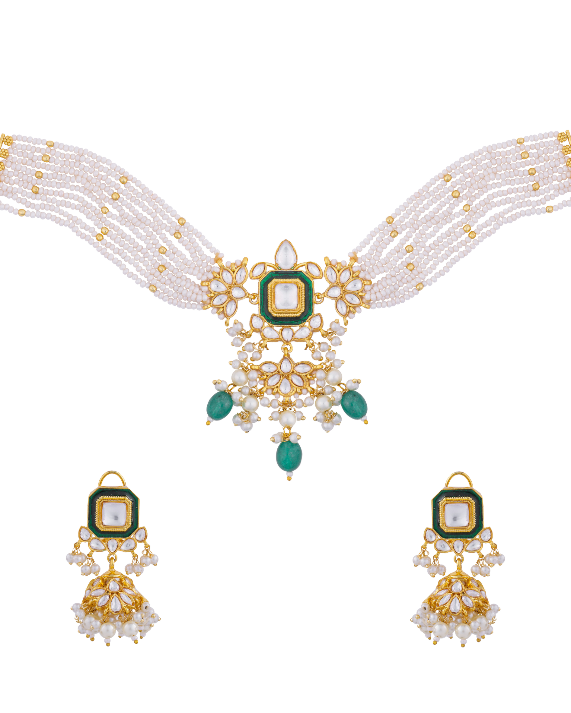 Step into a world of timeless elegance with our Traditional Kundan & Pearl Choker Set, a masterpiece that embodies the rich cultural heritage of Indian jewelry. This stunning choker set seamlessly combines the classic beauty of Kundan stones with the lustrous charm of pearls, creating a piece that exudes regal sophistication.